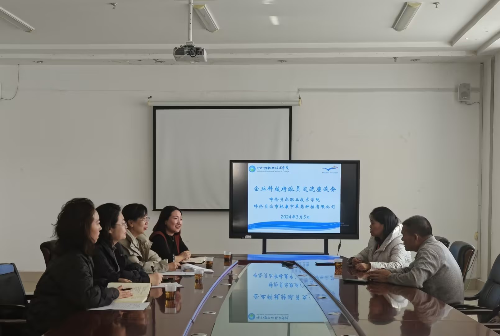 为发挥高校人才、科技和文化优势,服务地方经济和社会发展, 2024年3月5日11:00,呼伦贝尔职业技术学院教务处副处长刘佳、蒙医蒙药系副主任智慧及科技特派员杨秀华、艾丹老师与呼伦贝尔市林康中草药种植有限公司戚冬菊经理,技术员戚庆辉在德政楼720会议室开展中药材种植调研与技术交流活动。