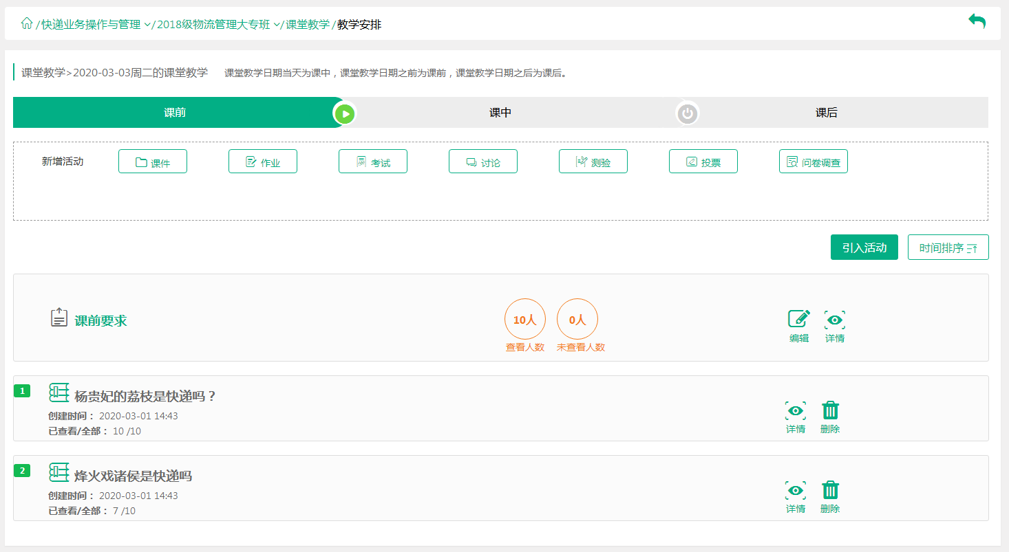 贸旅游系本周共开设27个专业班级的68门课程,在线教学教师37人,在线学习人数达11518人次。学生平均到课率91.6%。教师通过使用通过超星尔雅、超星直播、云课堂智慧职教等多种平台开展了多种形式的线上教学。教师结合课程情况,设置各种资源,例如PPT演示文稿、文本、视频、图形/图像、动画、音频、网页课件等等数量充足充分开展课堂提问、讨论、测验、答疑等多种形式的在线互动,调动学生学习积极性和主动性,积极提高在线教学实施效果。